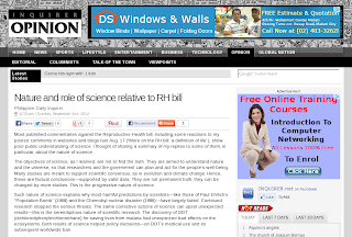 Flor Lacanilao, a retired professor of marine science, University of the Philippines Diliman, wrote a Letter-to-the-Editor and was published in the 3 September 2012 issue of PDI entitled "Nature and role of science relative to RH bill". I thought of commenting on some of the scientist's assertions:
